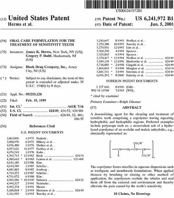 James K. Herms and Gregory P. Dodd, Oral Care Formulation for the Treatment of Sensitivity [of] Teeth, Block Drug Company, assignee, Patent 6,241,972, 5 June 2001.